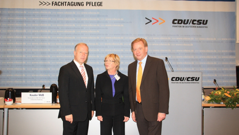 Berlin. Auf Einladung des Bundestagsabgeordneten Ingo Gädechens besuchte gestern die Geschäftsführerin der AMEOS-Pflegegesellschaft Holstein mbH, Frau Theresia Kleikamp, die Pflegefachtagung der CDU/CSU-Bundestagsfraktion. Auf der ganztägigen Veranstaltung diskutierten Pflegefachkräfte aus ganz Deutschland mit den Fachleuten der CDU/CSU-Bundestagsfraktion über die zukünftigen Herausforderungen der Pflegebranche. Den Fragen stellten sich unter anderem die Bundesfamilienministerin Dr. Kristina Schröder, der Fraktionsvorsitzende Volker Kauder, der Vorsitzende der Arbeitsgruppe Gesundheit Jens Spahn und der Vorsitzende der Arbeitnehmergruppe Peter Weiß.