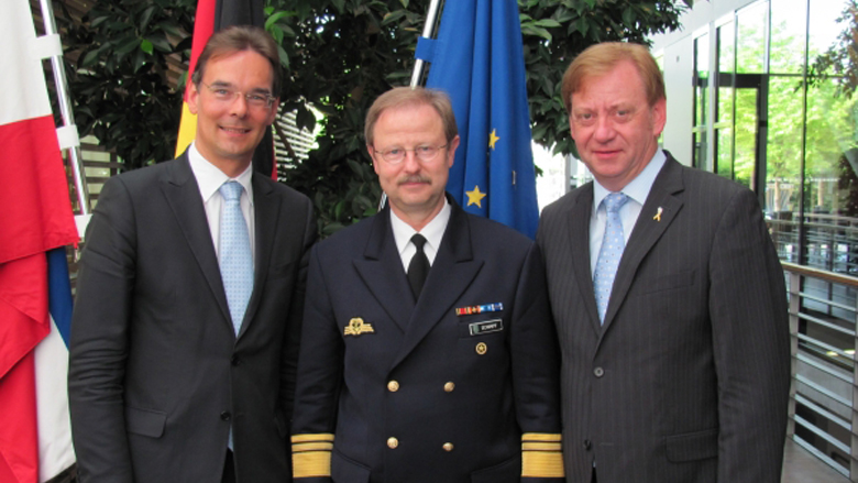 Bild (von links nach rechts): Ingbert Liebing, MdB (Vorsitzender des Arbeitskreises Küste der CDU/CSU-Fraktion im Deutschen Bundestag), Vizeadmiral Axel Schimpf (Inspekteur der Marine) und Ingo Gädechens, MdB (Mitglied des Küstenkreises und Sprecher für die Marine im Verteidigungsausschuss im Deutschen Bundestag).