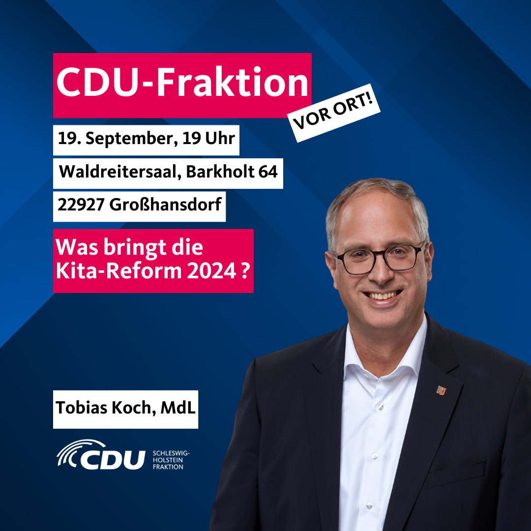 Welche Veränderungen bringt uns die Kita-Reform 2024? Darüber möchte die CDU-Landtagsfraktion am 19. September gemeinsam mit dem Landtagsabgeordneten und Fraktionsvorsitzenden Tobias Koch informieren und diskutieren.