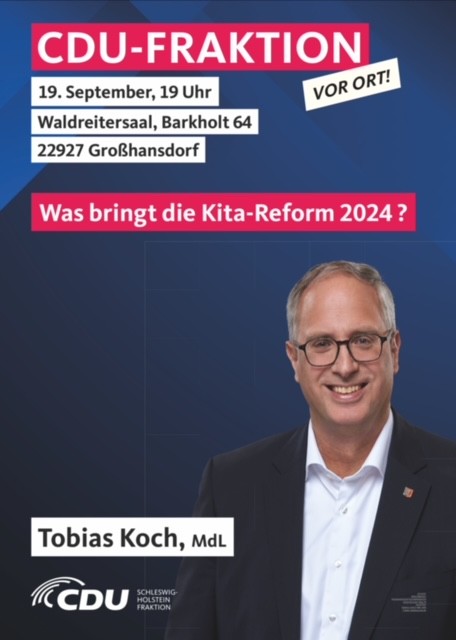 Der Vorsitzende der CDU Landtagsfraktion Tobias Koch wird über den aktuellen Stand berichten, sich den Fragen interessierter Bürgerinnen & Bürger stellen und steht zur Diskussion von Anregung zur Verfügung.
